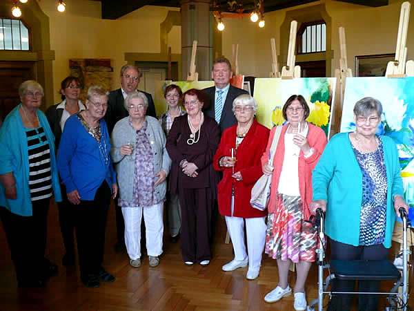 Bürgermeister Frank Hasenberg eröffnete die Vernissage mit einem Grußwort. Joana Skorupa, die die Künstlerinnen und Künstler anleitet, erklärte den Gästen - vorwiegend Mitarbeitende des Rathauses - die Entstehung der Bilder. Anschließend war Gelegenheit, bei einem Glas alkoholfreiem Sekt oder Orangensaft, die Bilder zu betrachten und mit den Künstlerinnen und dem Künstler ins Gespräch zu kommen.