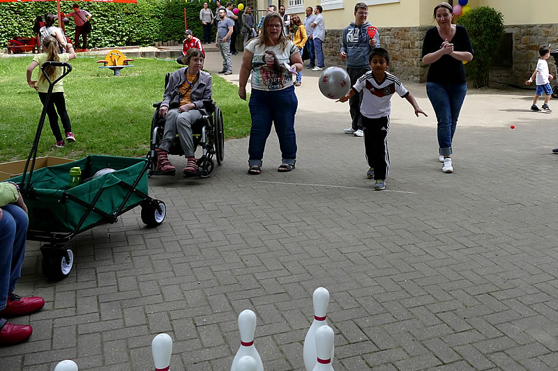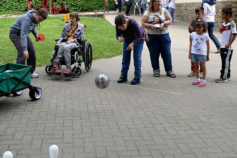 So konnten sie sich den übrigen Besuchern vorstellen und mit ihnen ins Gespräch kommen. Bewohnerinnen und Mitarbeiterinnen boten „Kegeln“ zur Unterhaltung für Jung und Alt an. Das Spiel machte allen viel Spaß und bildete eine Brücke. Die Barriere „Wie kann ich die Kinder und die Eltern ansprechen“, die viele Bewohnerinnen des Schöntals hatten, wurde so spielend überwunden.