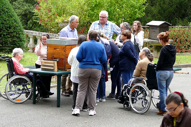 In Vertcoeur wurden wir schon erwartet. Die Führung durch den verwunschenen mehrere Hektar großen Park begann sofort. Ziel waren die Bienenstöcke. Der Imker erklärte uns alles ausführlich, Anne-Sophie Martin übersetzte und wir nickten: Alles ist so wie bei Imker Müller mit seinen Bienenstöcken auf dem Kälberkamp des Frauenheim.