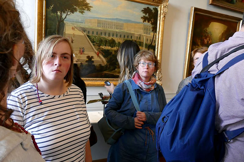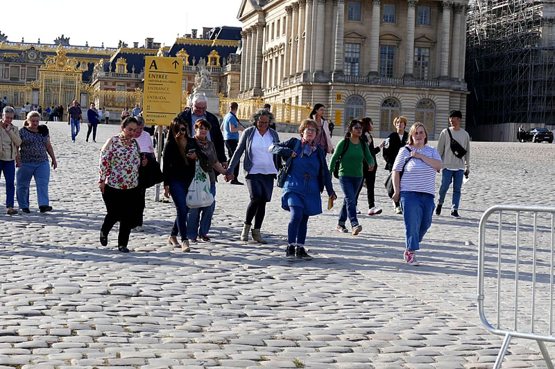 Wir fuhren die Avenue de Paris entlang, direkt auf das Schloss zu. Wir parkten wieder in vorderster Reihe. Den riesigen Schlosshof mit seinem Kopfsteinpflaster überquerten wir sehr vorsichtig. Wir gingen an der riesigen Schlange der Touristen vorbei, die um eine Eintrittskarte und wegen der Sicherheitskontrolle anstanden. „Drei Stunden Wartezeit.“, raunte uns jemand zu. Menschen mit Schwerbehinderung und ihre Begleitung (also wir alle) mit Schwerbehindertenausweis (also wie üblich nur Margret, Jenny, Anne-Sophie und Manuela) konnten kostenlos direkt durch die Sicherheitskontrolle gehen. Schon in Paris haben wir auch nette junge Männer mit Maschinenpistolen getroffen. In einer riesigen Menschenmenge gingen wir langsam von Zimmer zu Zimmer. Wir fanden am Schönsten die Gemälde von der polnische Königin irgendeines Ludwigs, vermutlich dem elften, und die Bilder der Lieselotte von der Pfalz. Beide Frauen lächeln sehr selbstbewusst und irgendwie verschmitzt – wie ein Lausbube. Die Besichtigung dauerte so lange, dass wir die Gärten nicht besichtigen konnten. Macht nichts. Die haben wir aus den Fenstern von oben schon gesehen. Alles war in Versailles riesig, aber nicht gemütlich. Für Britta, die wegen ihrer Krankheit nicht mitfahren konnte, haben wir im Schloss ein kleines Lavendel-Herz gekauft. Für Margret kauften wir als Muster ein größeres. Wenn sie in Rente ist, kann sie das Herz nachhäkeln, und wir können es mit Lavendel aus dem Garten füllen.