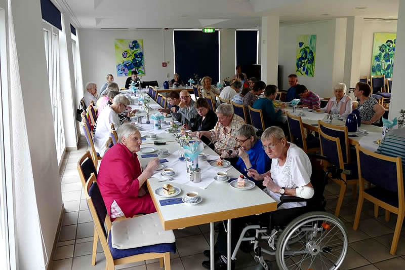 Für die Älteren - 31 Seniorinnen (ab 75 Jahren) - begann die Feier nachmittags mit Kaffee und „Wunsch-Kuchen“ – Erdbeer-Joghurt-Torte, Frankfurter Kranz und Obstkuchen – in der Cafeteria. Sie hatten sich zuvor einen gemütlichen Kaffeeklatsch ohne laute Musik gewünscht. Allerdings schauten viele bei der sich anschließenden Geburtstagsparty vorbei.