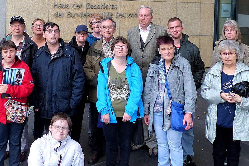 Im „Haus der Geschichte“ angekommen, führte ein Museumsführer die Teilnehmerinnen und Teilnehmer durch die Ausstellung. Was ist nicht alles seit 1945 in der Bundesrepublik Deutschland (BRD) und in der Deutschen Demokratischen Republik (DDR) geschehen?! Dabei ging es nicht nur um Politik, sondern auch um Lebensgefühl und Alltag in den jeweiligen Jahrzehnten, wie z.B. um die Mode und Haushaltsausstattung der 1960er Jahre. Gegen Ende der Ausstellung konnte der berühmte Torwartzettel von Jens Lehmann bestaunt werden, den er im Viertelfinale der Fußball-Weltmeisterschaft beim Elfmeterschießen gegen Argentinien verwendet hatte.