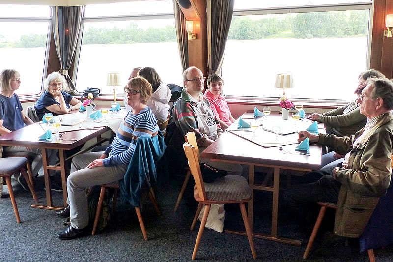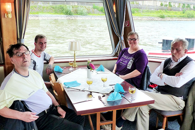 Die Wolken hatten sich verabschiedet und es kamen Sommergefühle auf, die nicht nur gute Laune machten, sondern auch einige zum spontanen Kauf von Eis verführte. In Linz stieg die Gruppe auf das Schiff MS Petersberg um. Bei leckerem Essen und Trinken ging es das Rheintal bis nach Bonn hoch. Alle bestaunten die Sehenswürdigkeiten vom Rolandseck über den Drachenfels bis hin zum „Langen Eugen“ in Bonn.