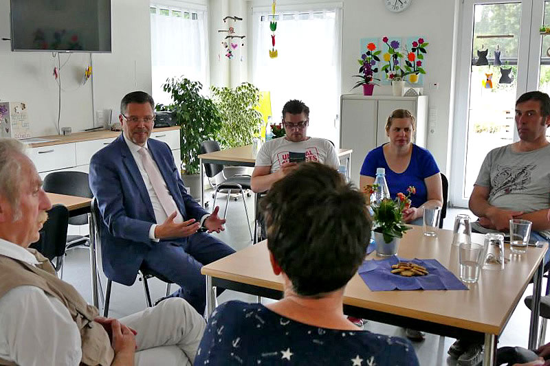 Der Arbeitskreis Politik, der 2017 die Fragen vorbereitet hatte, sowie die damaligen Teilnehmenden an der Wahlveranstaltung im Frauenheim waren sofort mit einer neuen Diskussionsrunde einverstanden. Da sich in den letzten zwei Jahren aber auch wieder viel Neues im Frauenheim getan hatte, wurde Bodo Middeldorf nicht nur Mitte Juli zum AK Politik eingeladen, sondern auch in den Berufsbildungsbereich der WfbM und in die Tagesstruktur Schöntal.