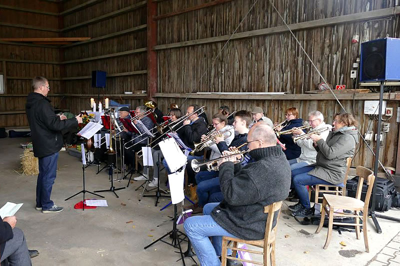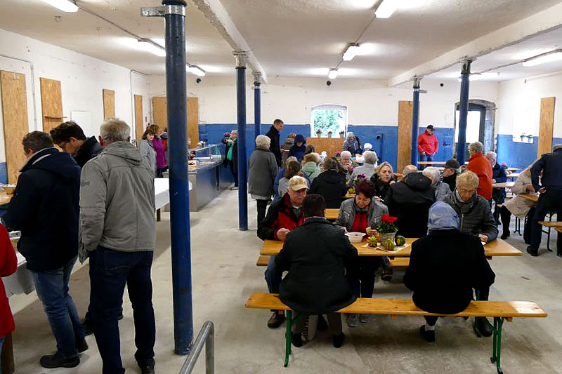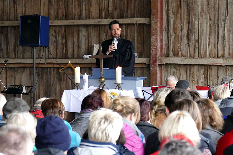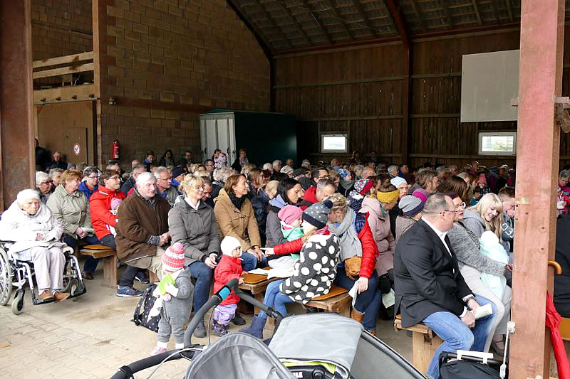 Sie alle saßen in der überdachten Remise zumindest im Trockenen. Nach dem Gottesdienst, den Gemeindepfarrer Michael Waschhof hielt, stärkten sich die Gäste bei Erbsensuppe oder Kaffee und Kuchen und plauderten in gemütlicher Atmosphäre im früheren Kuhstall.