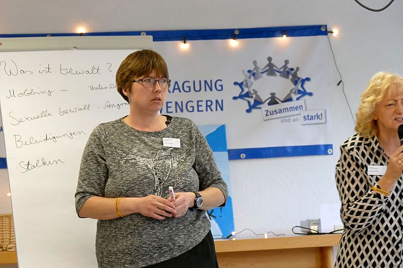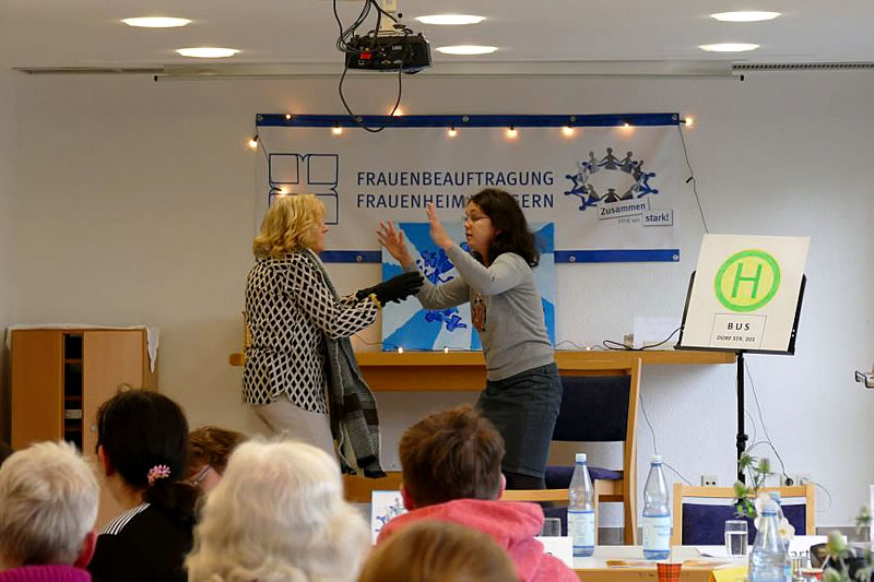 Im Anschluss an den Bericht erarbeiteten die Frauenbeauftragten mit den anwesenden Frauen, was Gewalt ist, in welcher Form sie ihnen im Alltag begegnet und wie sie sich davor schützen können. „Wir sind keine Fachfrauen. Wir können Euch nur raten“, meinten sie und sammelten Hinweise: es wurden unter anderem genannt, dunkle Ecken zu meiden, sich nie alleine im Dunkeln aufzuhalten, bei Angriffen laut zu schreien und „Stopp“ zu sagen: „Und macht einen wendo-Kurs.“