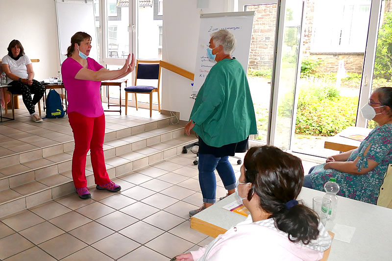 „Wir sind GEMEINSAM STARK!“ mit dem Motto der Frauengruppe endeten laut-stark alle fünf Veranstaltungen. „Fünf Veranstaltungen: drei am Böllberg, eine im Schöntal, eine in Wengern – das soll uns mal eine nachmachen! – Jetzt müssten alle Frauen gut vorbereitet sein. Sie können jetzt trainieren, keine Gewalt zu erfahren. ABER, wenn sie passiert, wie sie Hilfe bekommen.“ So lautete die Auswertung der Vorstellung des Leitfadens „Gewaltfrei – im Frauenheim Wengern“. Er ist ein Anti-Gewalt-Leitfaden von Frauen mit Behinderung für Frauen mit Behinderung