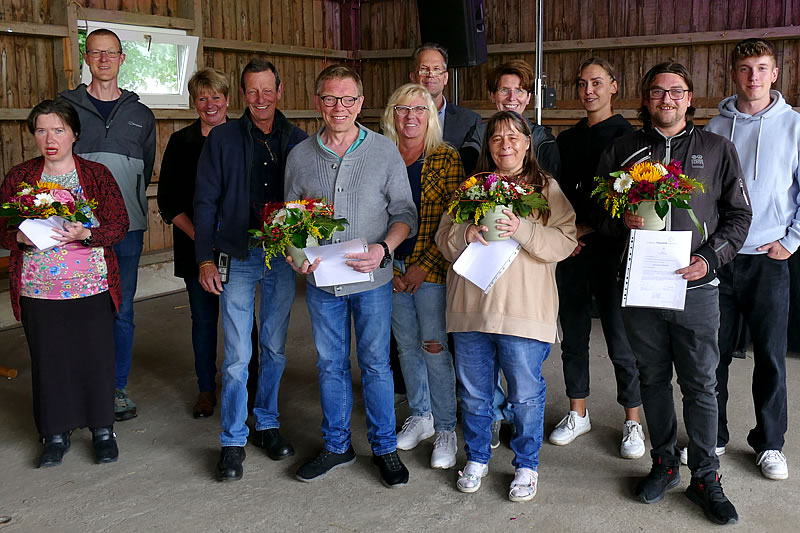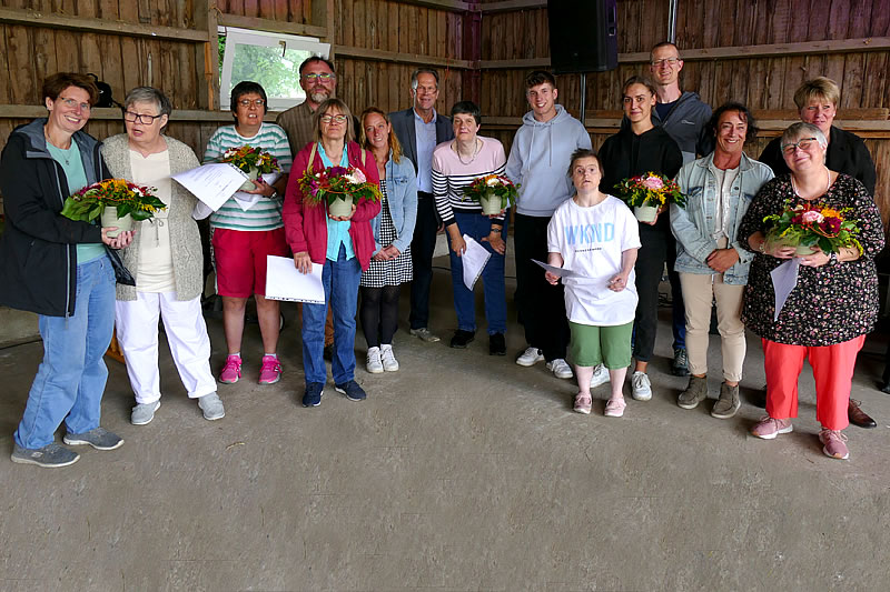 17 Jubilar*innen wurden mit Urkunde und Blumenstrauß geehrt. Darüber hinaus erhielten zwei Jubilarinnen eine Armbanduhr anläßlich 25 Jahre erfolgreicher Werkstattarbeit. Beglückwünscht für ihre langjährige Tätigkeit wurden die Beschäftigten durch den Werkstattleiter Thomas Schiebille und Gesamtleiterin Nadine Somer sowie von ihren jeweiligen Gruppenleiter*innen.