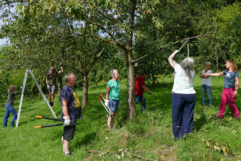„Pflanzschnitt für eine reine Pflanzentwicklung beim Steinobst “ hieß der Titel Ende Juni des Kurses im Gartenbaubereich des FRAUENHEIM WENGERN. Es war der dritte und letzte Workshop zum fachgerechten Obstbaumschnitt durch den Gärtnerin Sonja Breuker zehn hochmotivierte Teilnehmer*innen führte. Sie lernten die Grundkenntnisse des sommerlichen Pflanzschnitts an Obstbäumen.