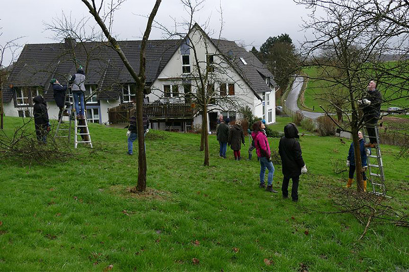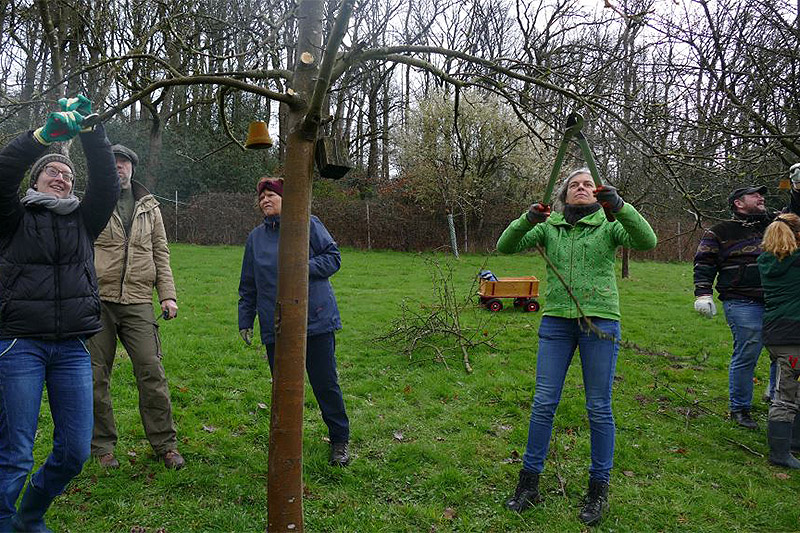Im Fokus stand die Vermittlung von Grundwissen über den „Fruchtschnitt“ an Jung-und Altbäumen. Die Frauen und Männer lernten, wie Bäume so geschnitten werden sollten, damit diese über einen harmonischen Kronenaufbau verfügen können und Kraft bekommen. Es wurde von Gärtnerin Sonja Breuker viel in der Theorie gezeigt. Schließlich probierten alle Teilnehmenden den Schnitt selbst aus. Die eigenen Fragen und Beobachtungen kamen nicht zu kurz und wurden mit der Gärtnerin geklärt und thematisiert.