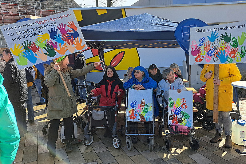 Bei dieser Aktion kamen alle zusammen und es gab viel Zulauf beim Kreativstand vom FRAUENHEIM WENGERN. Kinder, Rentner*innen und Menschen mit Behinderung machten mit den selbstgebastelten Händen aus Papier deutlich: Hand in Hand für Demokratie und Menschenrechte!